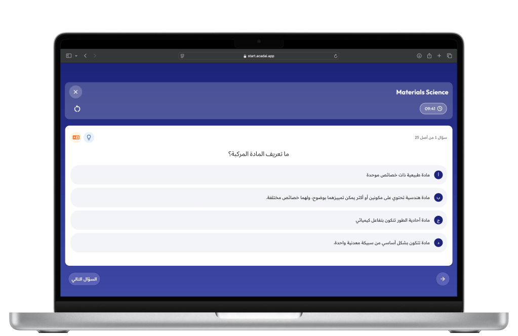 AcadAI يجهّز لك أسئلة اختيار من متعدد وفلاش كاردز بشكل ذكي من دروسك ومحاضراتك. يعني بدل ما تضيع وقتك تحاول تسويها بنفسك، التطبيق يختصرها لك بطريقة تناسب تخصصك وأسلوب مذاكرتك. كذا تقدر تراجع بسرعة، تختبر نفسك، وتثبت المعلومة في بالك بشكل أسهل وأسرع.